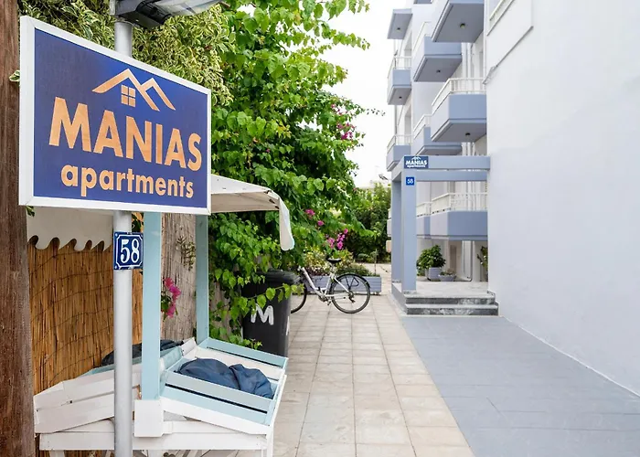 Das Manias Apartments liegt rund 8 Fußminuten vom Starnd Lambi beach entfernt und verfügt über einen Balkon und eine Essecke. In diesem Apartment gibt es Parkplätze in der Nähe.